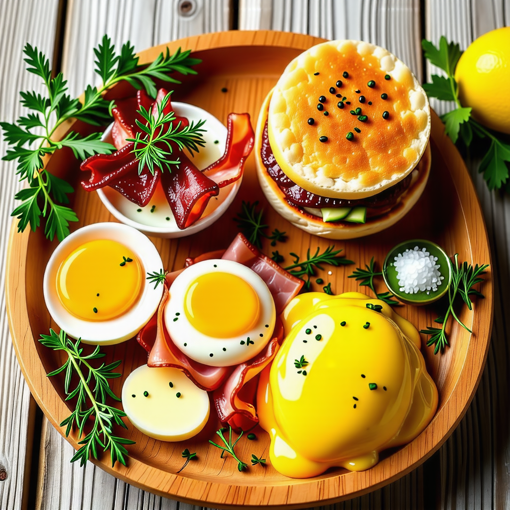- 조합하기: 구운 머핀 위에 햄 또는 베이컨, 삶은 계란을 올리고, 마지막으로 홀랜다이즈 소스를 뿌립니다. 신선한 허브를 장식으로 추가하면 완성입니다.
